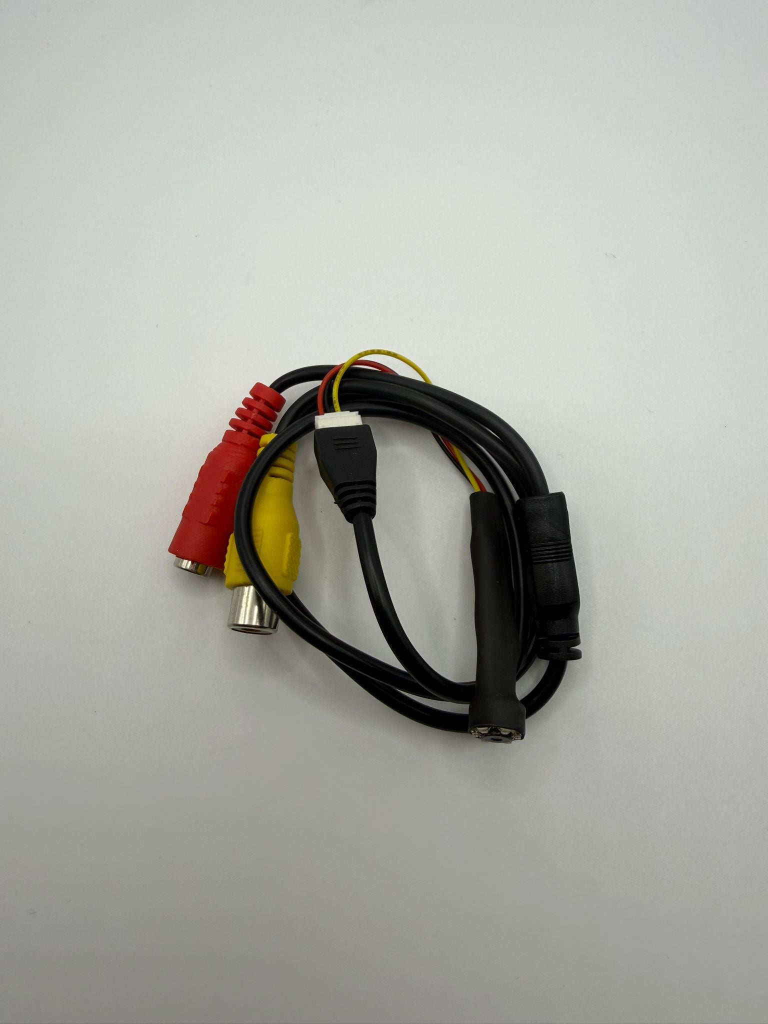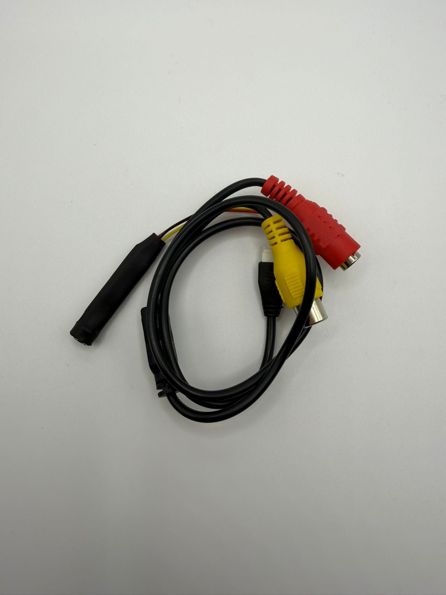 La microcamera è dotata di cablaggio standard con connettori RCA rosso, giallo e bianco, che permettono un’integrazione semplice e versatile in diversi sistemi di videosorveglianza.